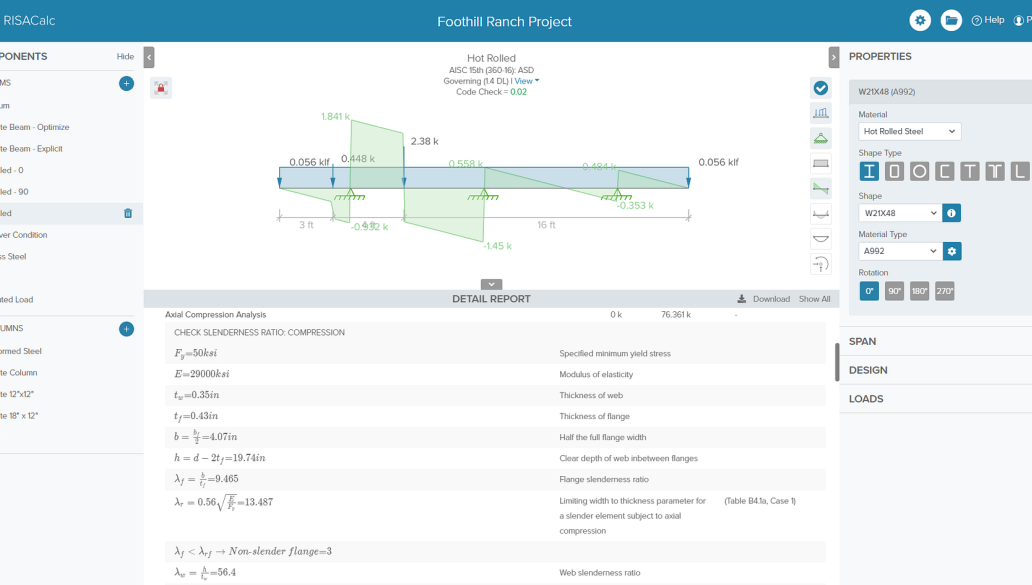 Der interaktive Detailbericht stellt alle Eingabeparameter dar und bietet eine Stelle zur Ansicht der Kraftdiagramme, Randbedingungen, Reaktionen und Code-Prüfergebnisse. Die Material-Code-Prüfungen umfassen auch erweiterte Berechnungen für jeden Grenzzustand, wodurch eine vollständige Transparenz der berechneten Kapazitäten erreicht wird.