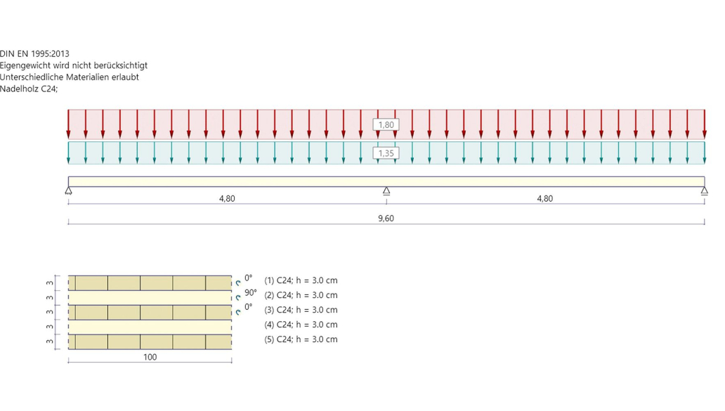 Bei der Bemessung wird die Brettsperrholzplatte als einachsig gespanntes Balkenelement betrachtet. Sie wird durch einen ein Meter breiten Streifen idealisiert. Die Bemessung erfolgt nach dem Schubanalogieverfahren. Damit unterliegen die statischen Systeme und die Belastungen ganz bewusst nicht den Einschränkungen des Gamma-Verfahrens. Beim Grenzzustand der Tragfähigkeit wird die Situation sowohl ständig als auch vorübergehend betrachtet. Es werden jeweils Nachweise von der Normalspannung, der Schubspannung aus Querkraft sowie der Rollschubspannung geführt. Beim Grenzzustand der Tragfähigkeit kann zusätzlich die Situation Brandfall bewertet werden. Im Brandfall basiert die Bemessung auf dem Treppenmodell und berücksichtigt gegebenenfalls abfallende Schichten. Außerdem wird im Rahmen von HTB+ der Grenzzustand der Gebrauchstauglichkeit untersucht.