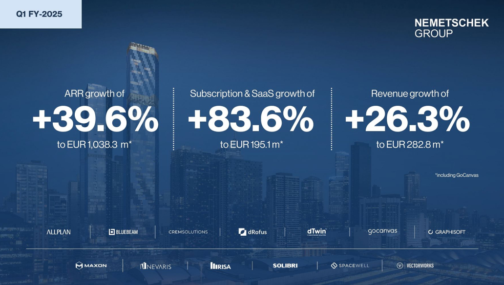 München, 30. April 2025 – Die Nemetschek Group, ein global agierender Anbieter von Softwarelösungen für die Bau- und Medienbranche, ist mit einem starken Umsatzwachstum von 26,3% (währungsbereinigt: 25,0%) auf 282,8 Mio. Euro sehr erfolgreich ins Geschäftsjahr 2025 gestartet.