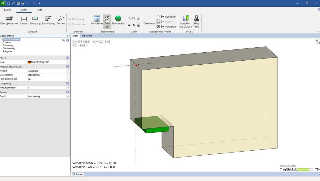 Mit Querschnittsnachweis Stahl SQN+, Querschnittsnachweis Stahlbeton B2+ und Holzbaudetails HO12+ wurden drei zentrale FRILO-Lösungen mit der modernen PLUS-Oberfläche ausgestattet. Das SQN+ (ehemals ST7) führt den Querschnittsnachweis von Stahlquerschnitten im Grenzzustand der Tragfähigkeit. Die Nachweisführung erfolgt dabei nach Eurocode 3. Mit dem B2+ (Nachfolger des B2) lassen sich indes Querschnitte für Biegung mit Längskraft sowie für Querkraft bemessen. Des Weiteren können Rissbreiten- und Spannungsnachweise geführt oder die effektive Steifigkeit ermittelt werden. Das neue PLUS-Programm HO12+ (Nachfolger des HO12) eignet sich zur Berechnung und Bemessung von Ausklinkungen (Vollholz- und Brettschichtholz) und Durchbrüchen (Brettschichtholz) in Holzträgern. Die für die Nachweise erforderlichen Schnittgrößen und Abmessungen werden vom Anwender eingegeben. Es lassen sich Nachweise der aufnehmbaren Zugkraft, des Restquerschnittes und der Verstärkung führen.