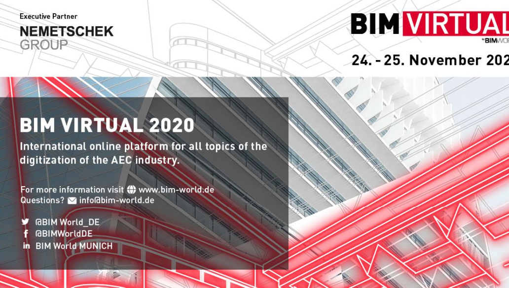 Die BIM World MUNICH ist seit fünf Jahren eine führende Networking-Plattform im deutschsprachigen Raum für die Digitalisierung der Bau-, Immobilien- und Infrastrukturbranche. Die jährliche Veranstaltung in München besteht aus einem zweitägigen internationalen Kongress und einer Fachmesse mit integrierten offenen Foren. Die 5. BIM World MUNICH 2020 wurde aufgrund der aktuellen Einschränkungen auf 23./24. November 2021 verschoben. Als Alternative findet in diesem Jahr am 24. und 25. November 2020 die BIM Virtual 2020 statt.