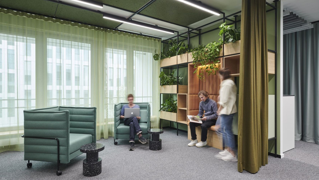 While the classic office spaces are kept neutral in blue and gray, shades of green combined with orange niches and light oak furniture accentuate the common areas. The meeting rooms are clad in black slats for a sophisticated look.