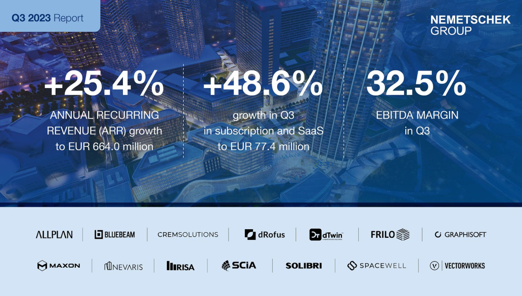 "Our strong third quarter shows that the Nemetschek Group remains clearly on a growth path while simultaneously transitioning to a subscription and SaaS business model and despite the challenging economic environment," said Yves Padrines, CEO of the Nemetschek Group. "We continue to consistently implement our strategy of generating value-added growth and accelerating the digital transformation and the shift to a more sustainable future for our customers. With our new and strong executive leadership team, I look very positively into the future. We will continue to leverage the great potential in our markets and consistently drive our strategic focus topics such as the ongoing subscription and SaaS transformation, the further internationalization, the increase of our internal efficiency, and new technologies. We recently introduced our new horizontal, open and data-driven cloud-based digital twin platform dTwin to the market. Additional innovations and features in the area of artificial intelligence and sustainability will follow."