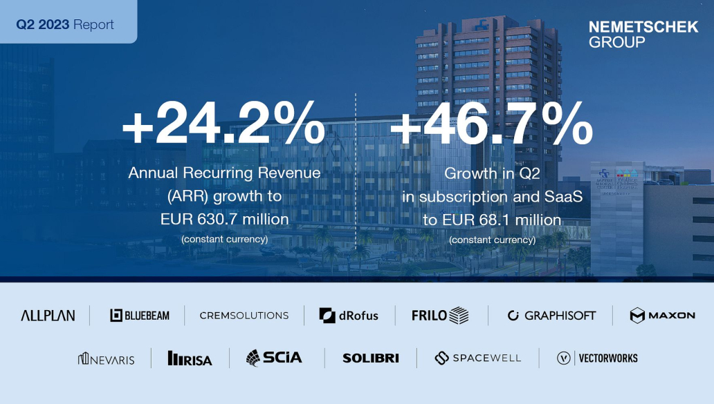Munich, July 31, 2023 - The Nemetschek Group, a globally leading software provider for digital transformation in the construction and media industries, is on track to achieve its full-year guidance after the first six months of 2023. The MDAX-listed Group continued to successfully transition its business model from license to subscription and SaaS offerings in the second quarter of 2023, reaching its peak in 2023. This is reflected in the continued very strong growth of this revenue category as well as the continued strong performance of annual recurring revenue (ARR). In line with expectations, the profitability in Q2 was impacted by the business model transition as well as planned one-offs.