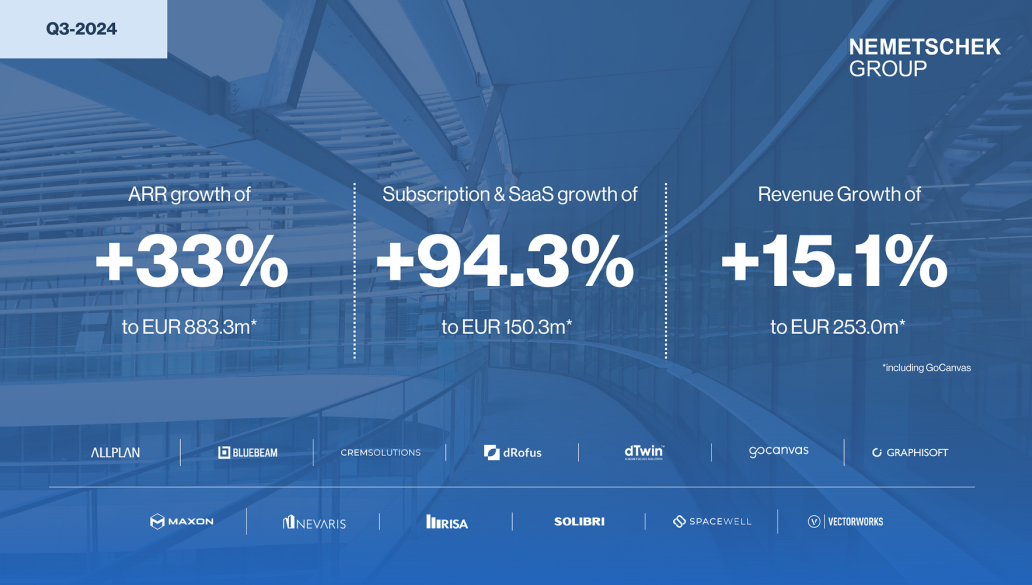 The Nemetschek Group continued its profitable growth course in Q3 2024. Growth was once again driven by subscription and SaaS revenue, which increased to a new record level. Based on the successful development in the first nine months, the Executive Board reiterates both its previous outlook for the operating business and the extended outlook (following the acquisition of GoCanvas).